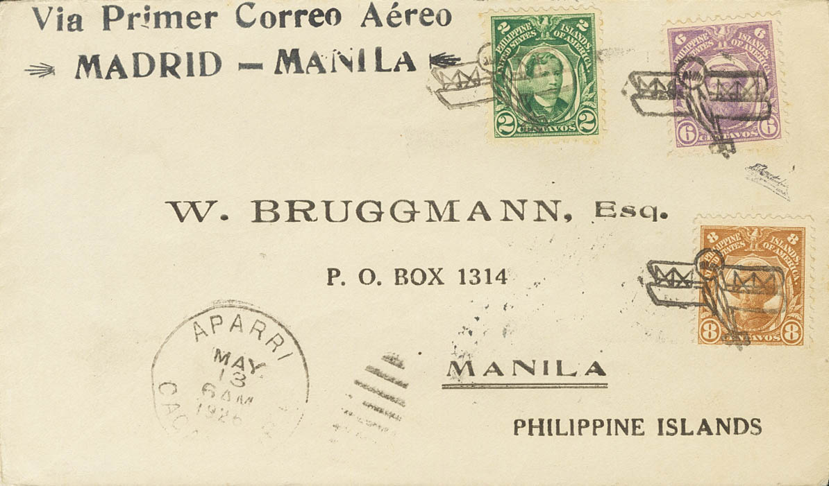 Yvert 204, 206, 207. 1926. 2 cents green, 6 cents violet and 8 cents bistre. APARRI to MANILA. Postmark "fancy" (airplane) and mark RAID-MADRID-MANILA on the front, in black and mark MADRID-TO MANILA FLIGHT / ACCOMPLISHED BY / SPANISH AVIATORS on the back. MAGNIFICENT.