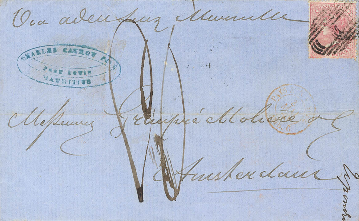 Yvert 25. 1860. 4 p pink. PORT-LOUIS to AMSTERDAM (NETHERLANDS). OVAL DE BARRAS postmark and on the front handwritten "Via Aden Suez Marseille" and handwritten postage. MAGNIFICENT AND RARE DESTINATION.
