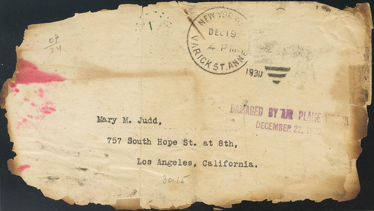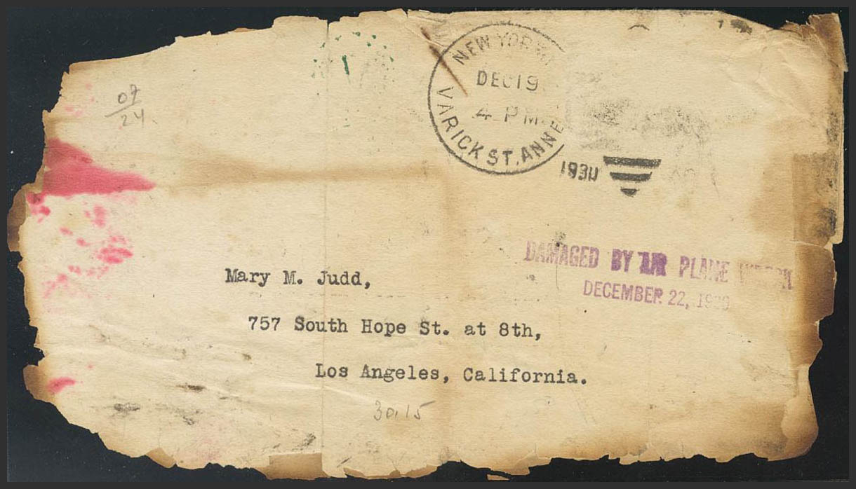 1930. Franked with stamps but detached in the accident. NEW YORK to LOS ANGELES. Plane of the Western Airlines company that crashed in Alhambra (California), in which a large part of the mail was burned and the mark DAMAGED BY AIR PLANE WRECK / DECEMBER 12-1930, in violet, was applied to the few letters recovered. MAGNIFICENT AND VERY RARE, NOT REVIEWED IN NIERINCK'S WORK.