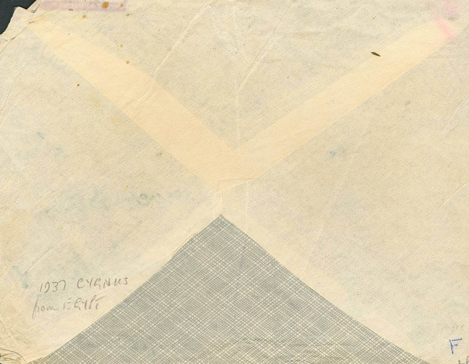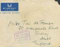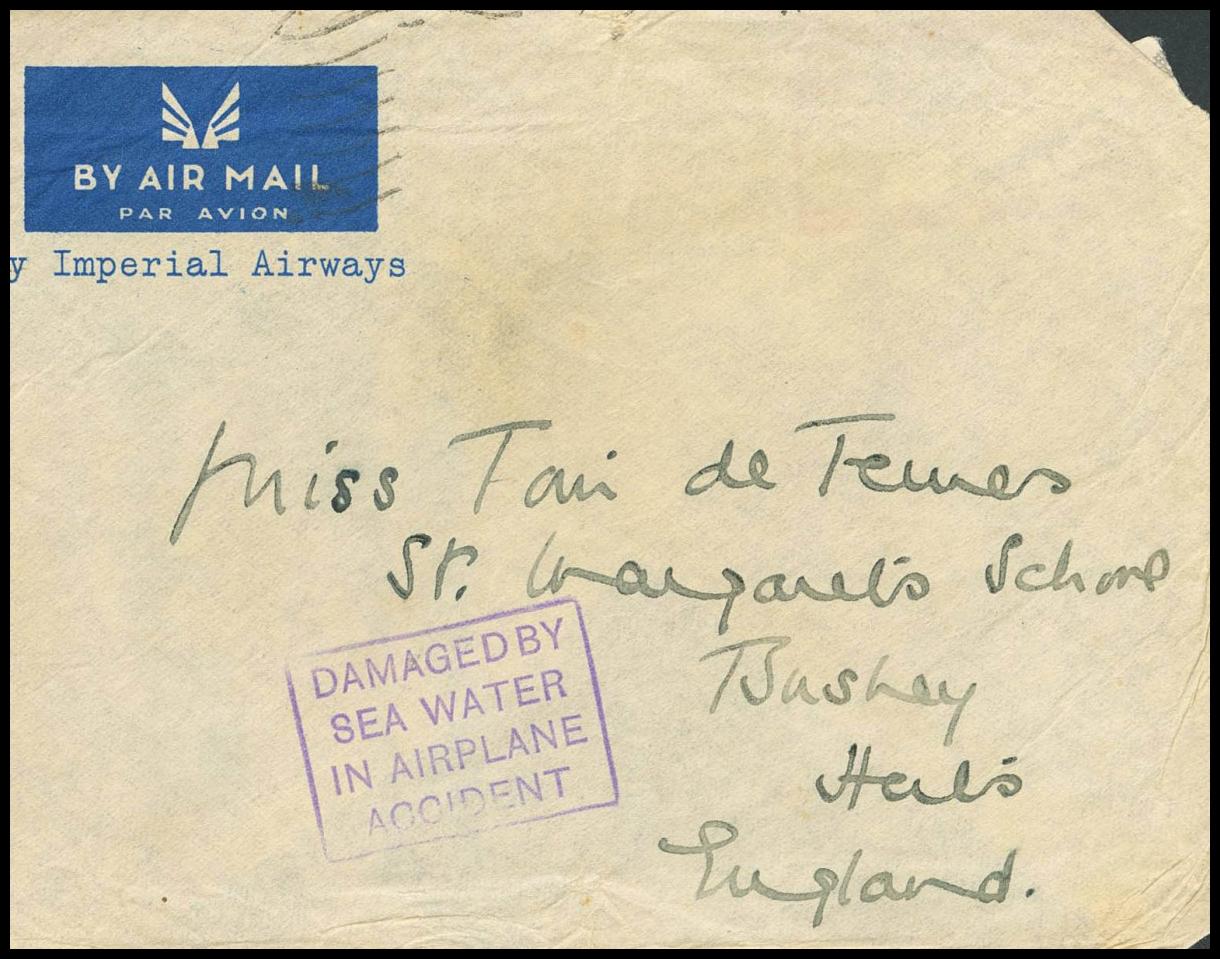 (1936ca). Addressed to BUSHEY. In our opinion, it is the Imperial Airways flight from the Orient to Great Britain that crashed in Mirabella Bay (Crete). Various marks are applied to the salvaged correspondence, in this case DAMAGED BY / SEA WATER / IN AIRPLANE ACCIDENT, in purple. MAGNIFICENT AND RARE.