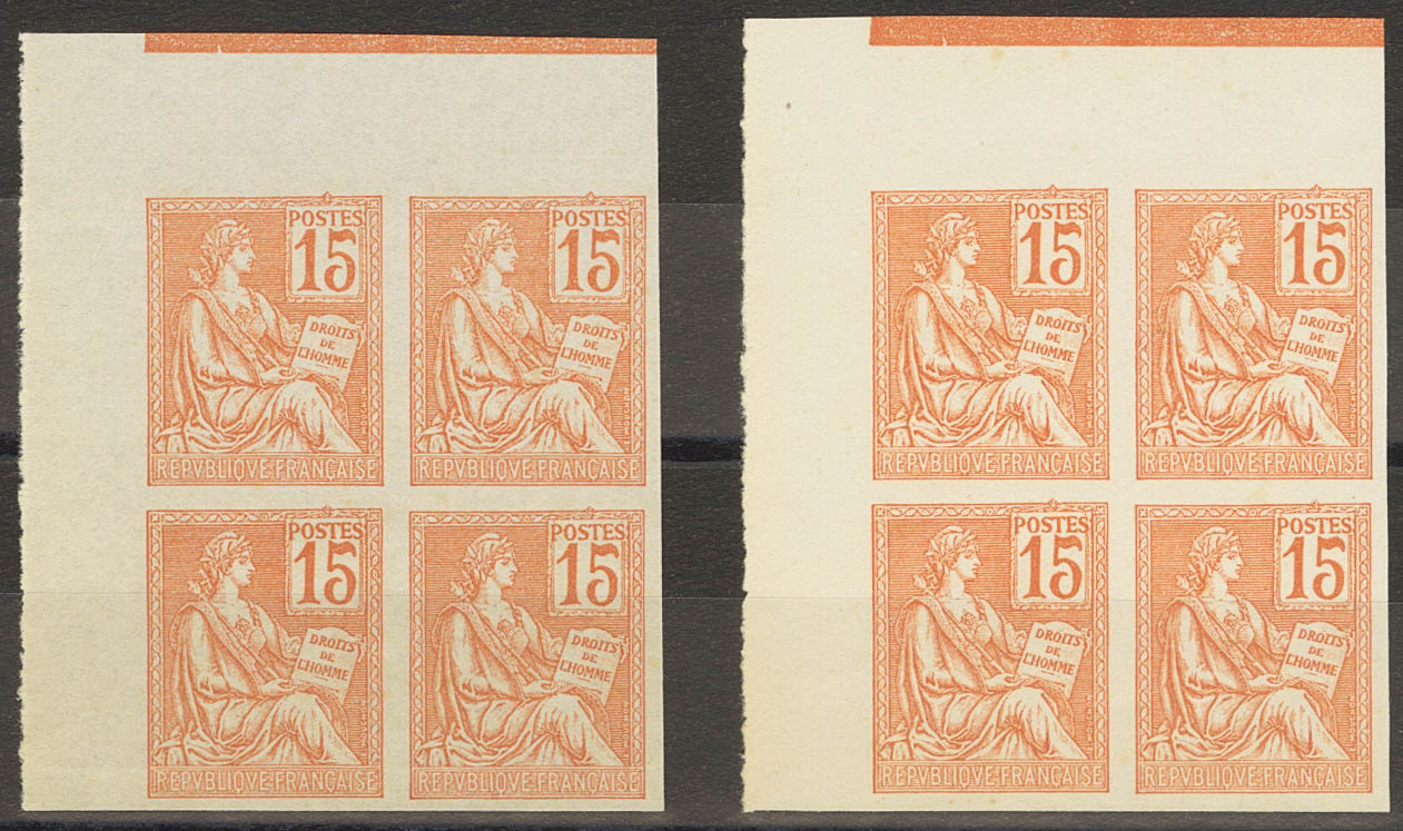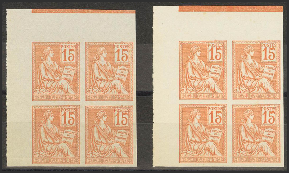 (★)Yvert 117c(8). 1900. 15 orange cts, two blocks of four. NO TEETH. MAGNIFICENT. Yvert 2014: 2,200 Euros