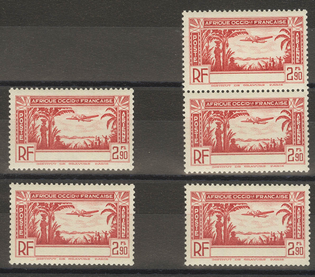 ★★Yvert 2a(5). 1940. 2´90 f red, five stamps. Without legend COTE D'IVOIRE. MAGNIFICENT. Yvert 2013: 500 Euros