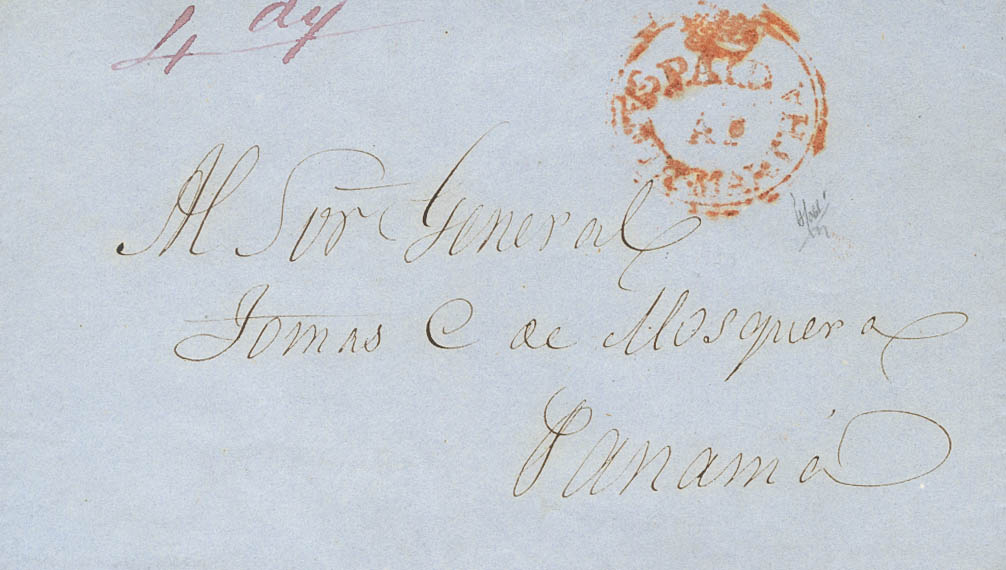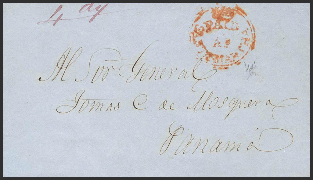 1850. SANTA MARTA (COLOMBIA) to PANAMA. PAID / AT / ST.MARTHA mark, in red and "4 d" handwriting. MAGNIFICENT AND VERY RARE. (Gibbons CC6, £1,900)
