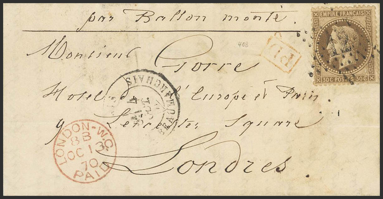 Yvert 30. 1870. 30 chestnut cts. PARIS to LONDON (ENGLAND), possibly transported by the Ballon "Armand Barbés". On the front date PARIS / BEAUMARCHAIS / 5E 4-OCT-70 and arrival on the front. MAGNIFICENT AND RARE.