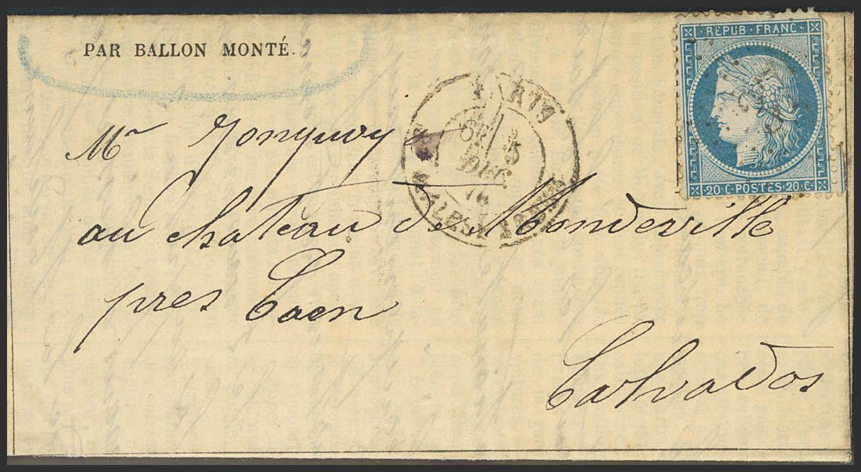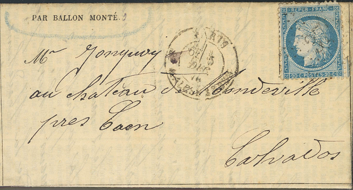 Yvert 37. 1870. 20 cts blue. PARIS to CALVADOS, transported by the Ballon "Denis Papin". On the front date PARIS / BD.MALES HERBES / 6E 5-DEC-70, on the back arrival. MAGNIFICENT AND RARE.
