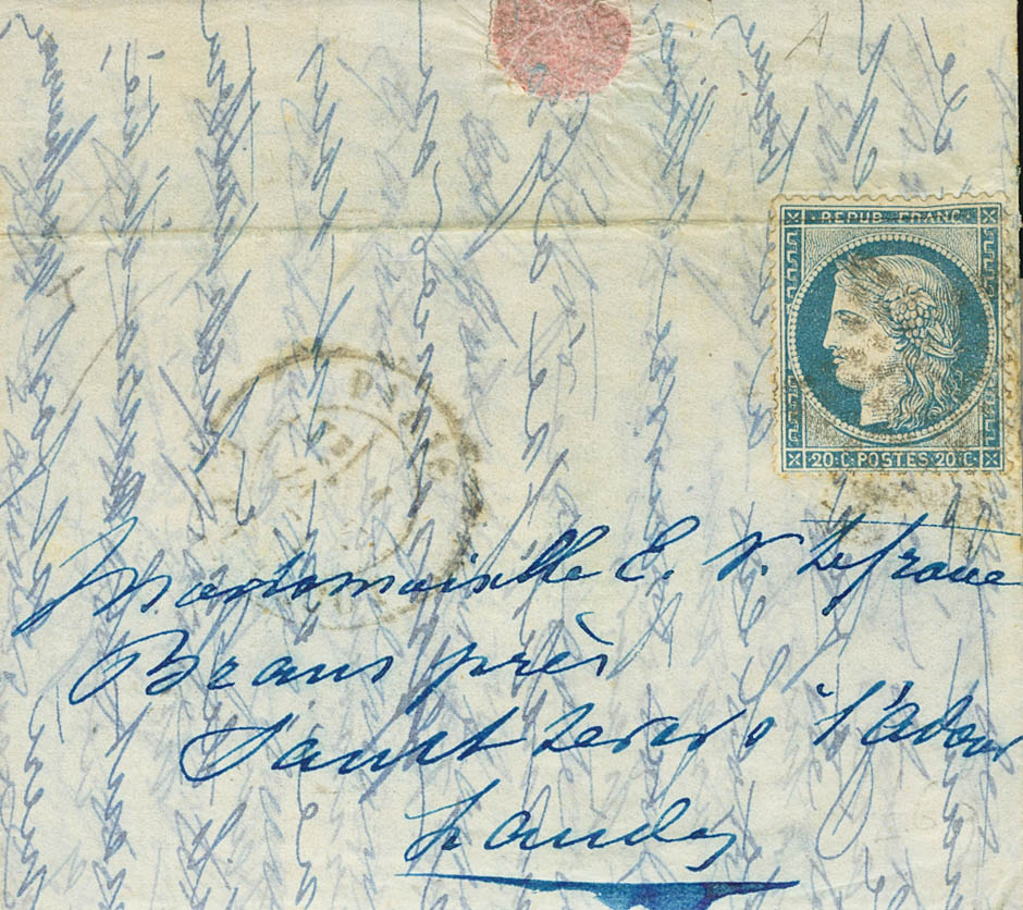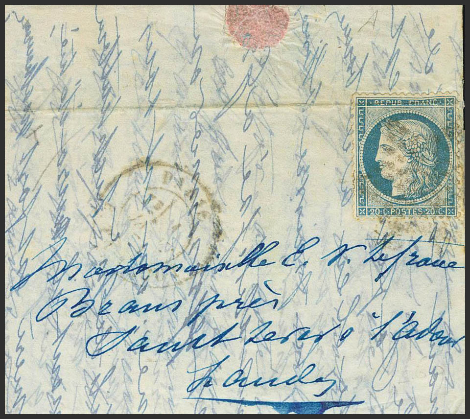 Yvert 37. 1871. 20 ctsw blue. PARIS to SAINT SEVER L´ADOUR, transported by the Ballon "Newton". On the front date stamp PARIS / 1E. 1-JANV-70. MAGNIFICENT.