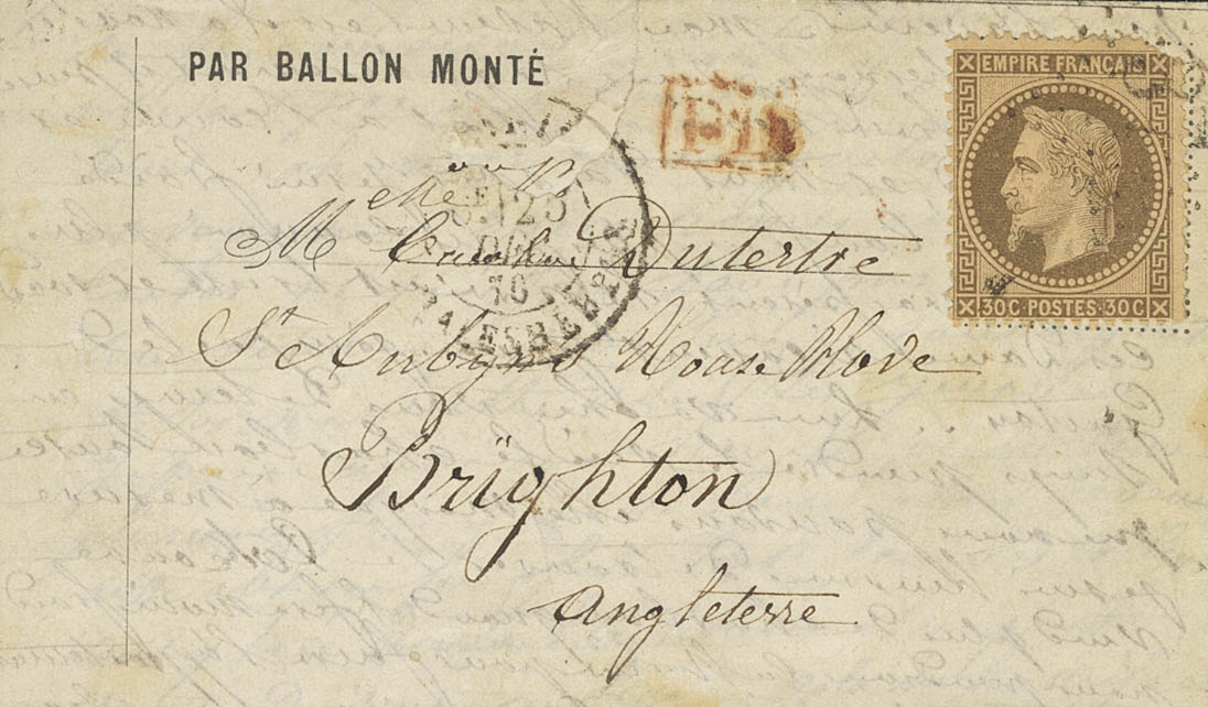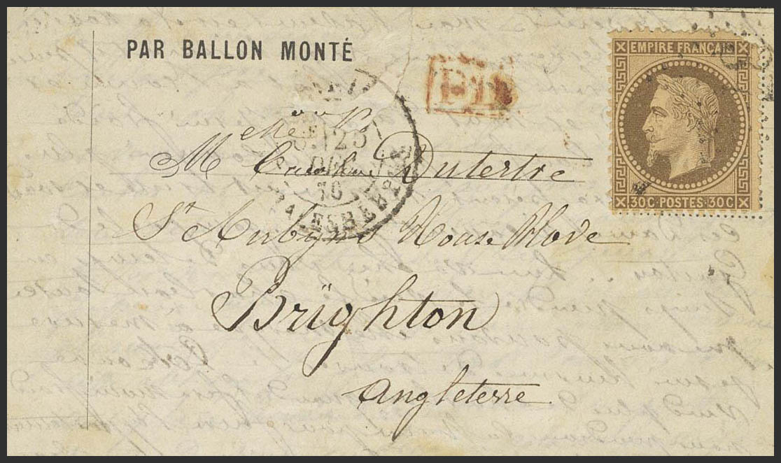Yvert 30. 1870. 30 cts chestnut (small defect in the corner). PARIS to BRIGHTON (ENGLAND), transported by the Ballon "Tourville" (small erosion on the front). On the front date PARIS BD.MALESHERBES / 6E 25-DEC-70 and PD mark, in red. BEAUTIFUL AND VERY RARE DESTINATION.