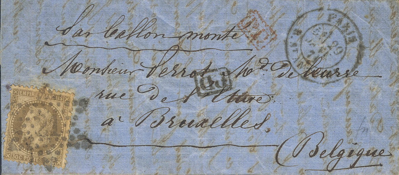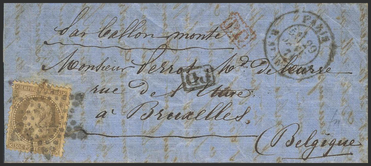 Yvert 30. 1871. 30 chestnut cts. PARIS to BRUSSELS (BELGIUM), transported by the Ballon "General Cambrone". Submitted one day after the end of the Prussian siege of Paris (January 29, 1871). Inside the letter that begins with "Enfin c'est fini" (it's finally over), it is summarized how Paris has been left after the siege, the looting of the city, the actions of the National Guard, as well as other important annotations on daily life before and after the siege, in our opinion a text of enormous historical importance. MAGNIFICENT AND VERY RARE, NOT ONLY BECAUSE OF ITS DESTINATION TO BELGIUM, BUT BECAUSE IT IS THE LAST BALLOON AND LAST KNOWN DATE OF THE BALLON MONTES.
