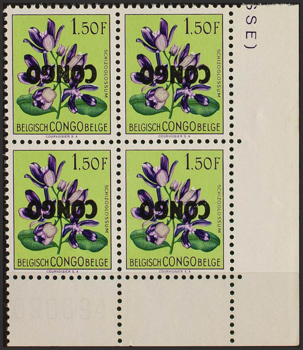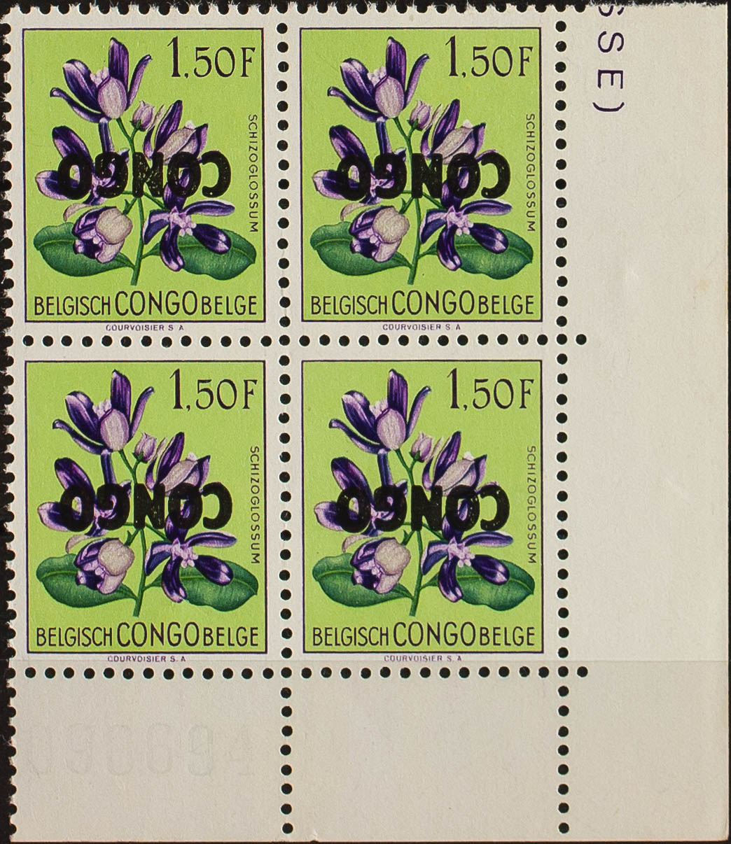 English ★★Yvert 389(4). 1960. 1´50 f multicolored, block of four. REVERSED OVERLOAD. MAGNIFICENT. (COB 389a)