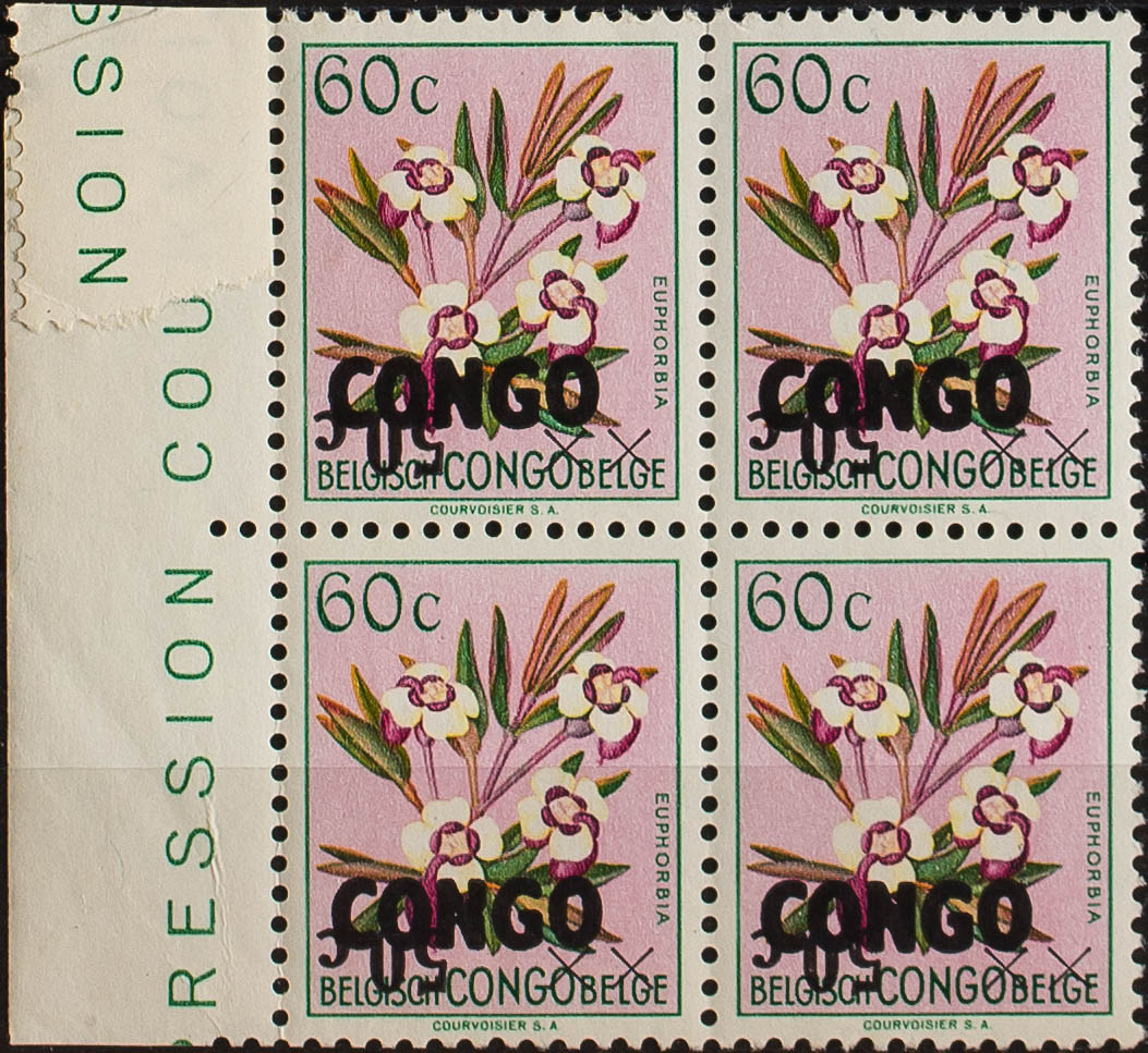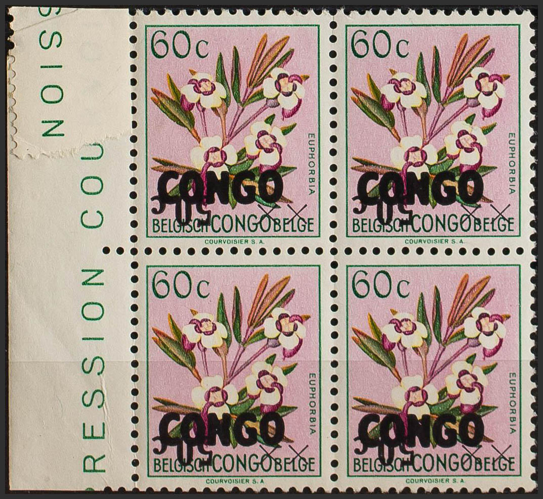 ★★Yvert 386(4). 1960. 50 cts on 60 multicolored cts, block of four. Variety OVERLOAD 50 C, inverted. MAGNIFICENT. (COB 386b)