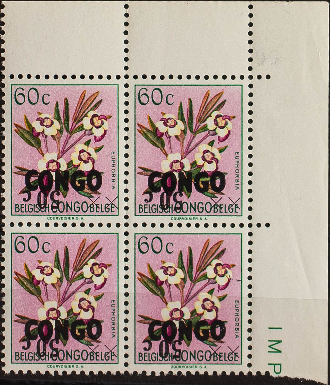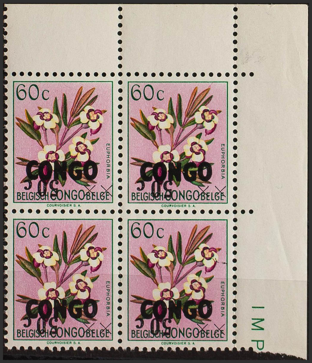★★Yvert 386(4). 1960. 50 cts on 60 multicolored cts, block of four. Variety OVERLOAD 50 C, inverted. MAGNIFICENT. (COB 386b)