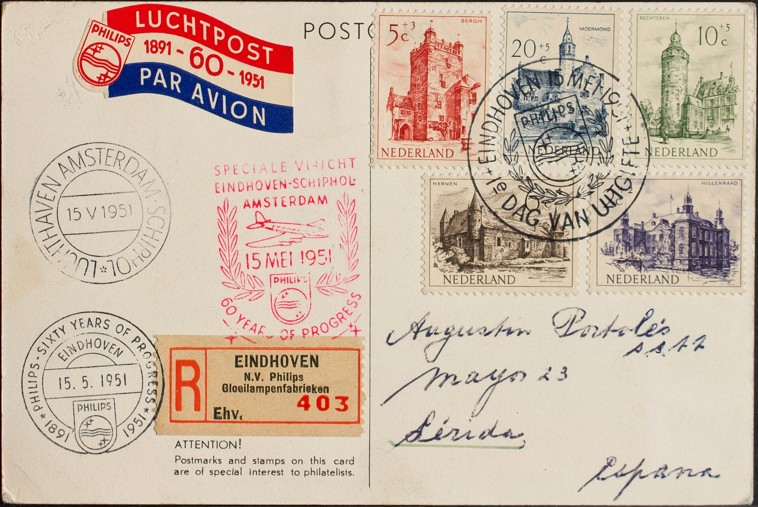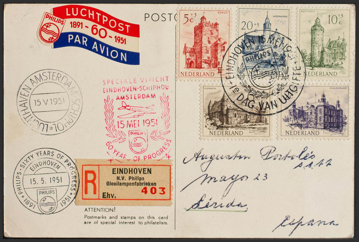 English Yvert 554/58. 1951. Complete series. Certified Post Card from EINDHOVEN to LERIDA. On the front it marks SPECIALE VLUCHT / EINDHOVEN-SCHPHOL / AMSTERDAM / PHILIPS / 60 YEARS OF PROGRESS, in red and on the back arrival. MAGNIFICENT.