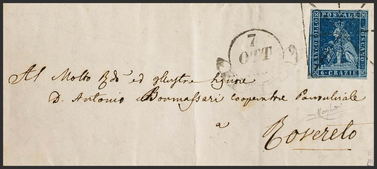 Yvert 7. 1851. 6 crazie dark blue on bluish. FLORENCE to ROVERETO. SPIDER silent postmark (rectangular). MAGNIFICENT. (Sasson 7)