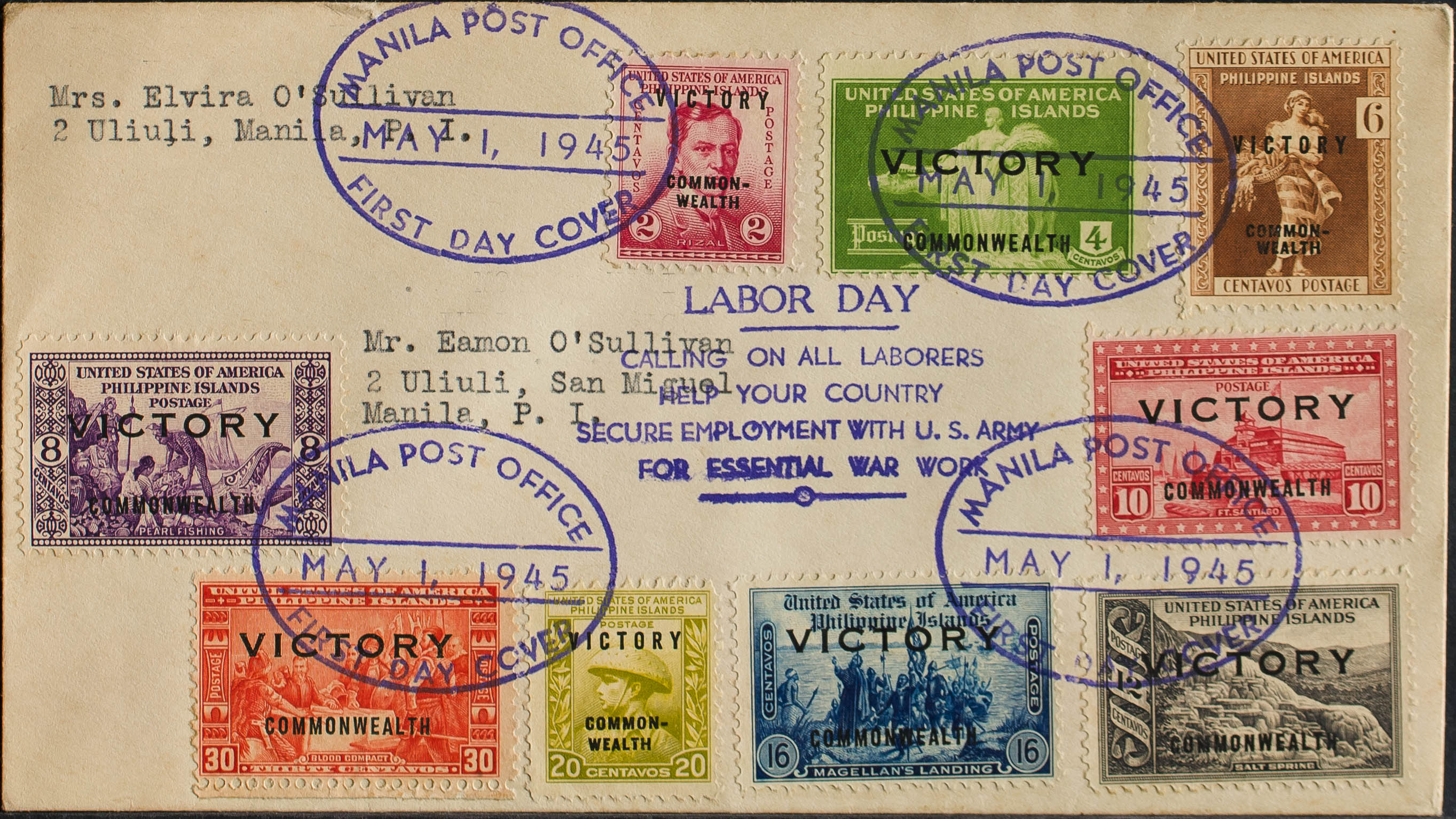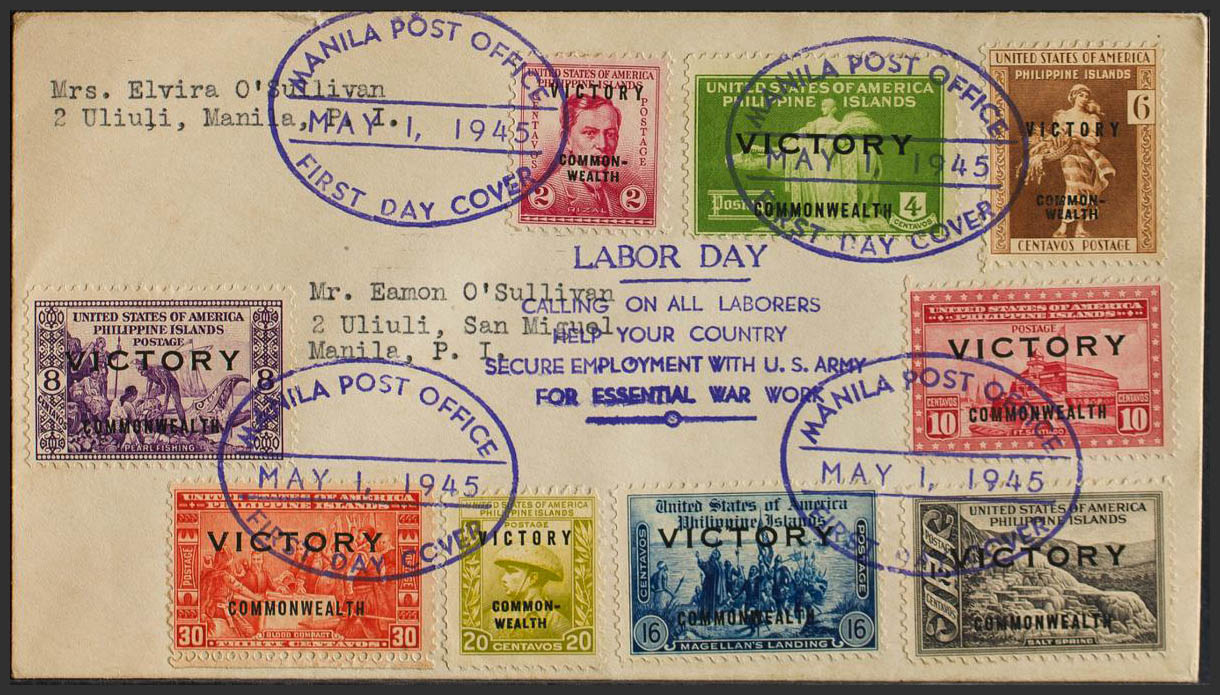 Yvert 319A/F, 319H/K. 1945. 2 cts, 4 cts, 6 cts, 8 cts, 10 cts, 12 cts, 16 cts, 20 cts and 30 cts. First Day Cover. Postmark MANILA POST OFFICE, in violet. MAGNIFICENT.