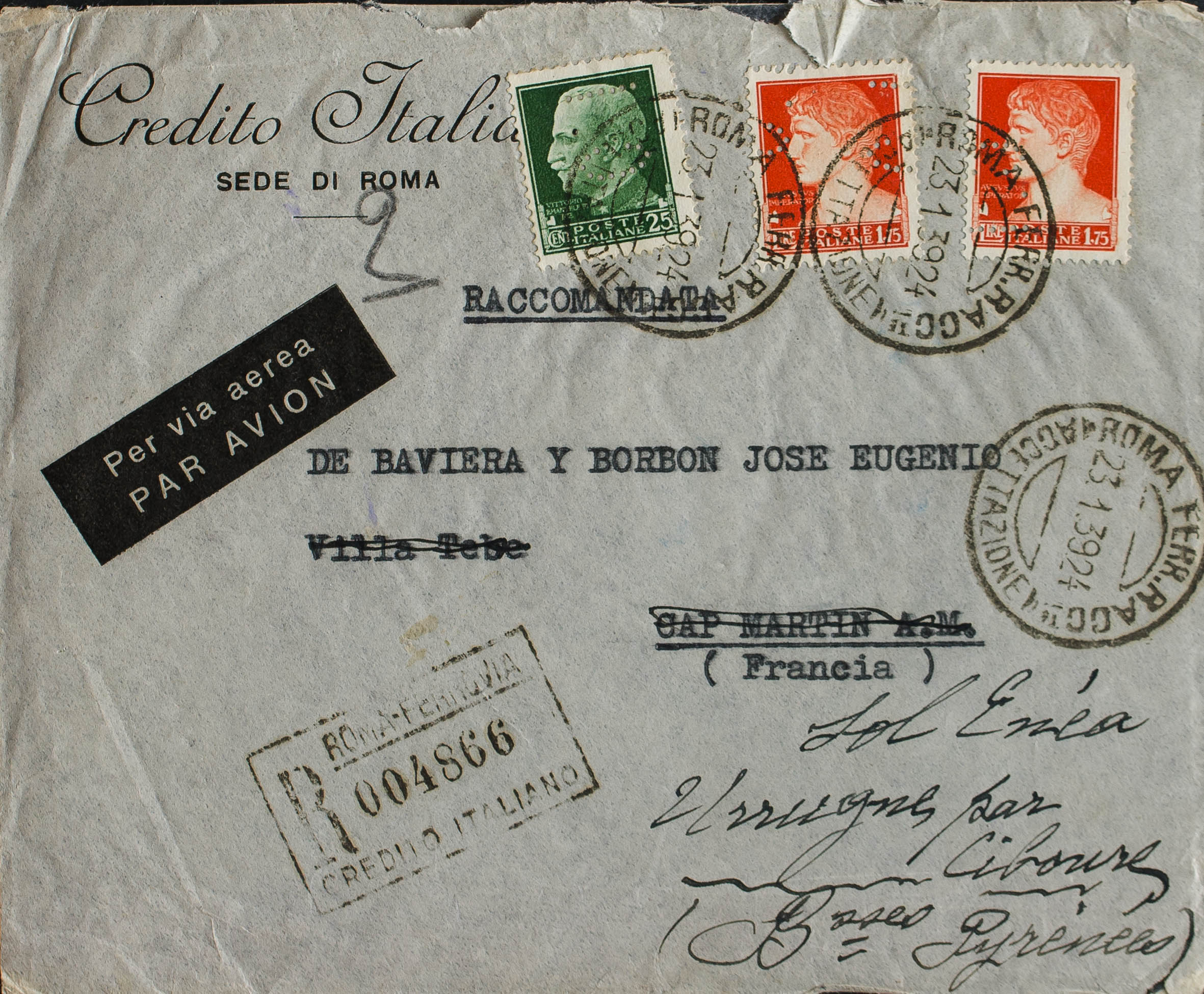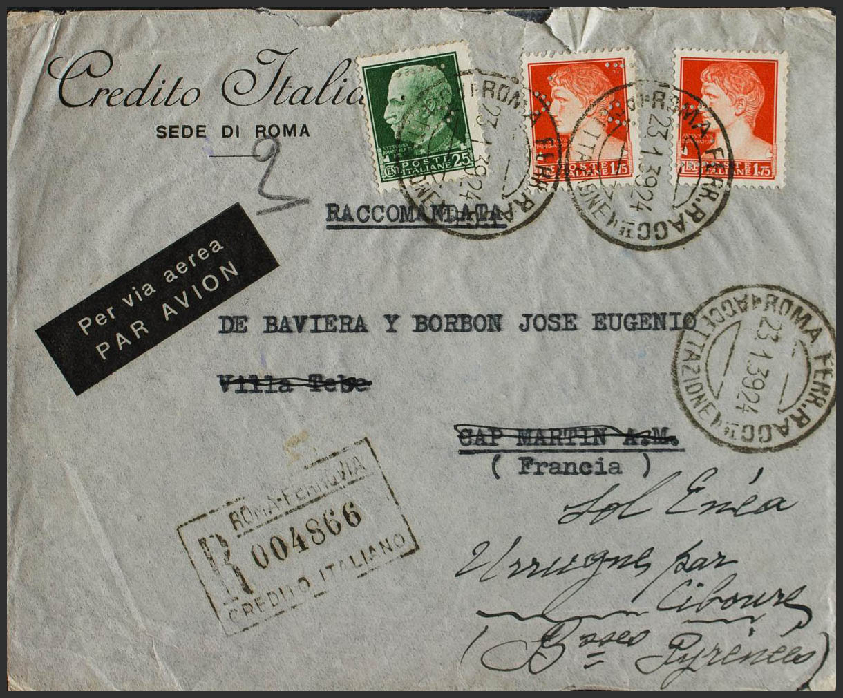 1939. 25 cts green and 1.75 l red orange, two stamps. Certificate from ROME to URRUGNE (FRANCE). On the back arrival. MAGNIFICENT.