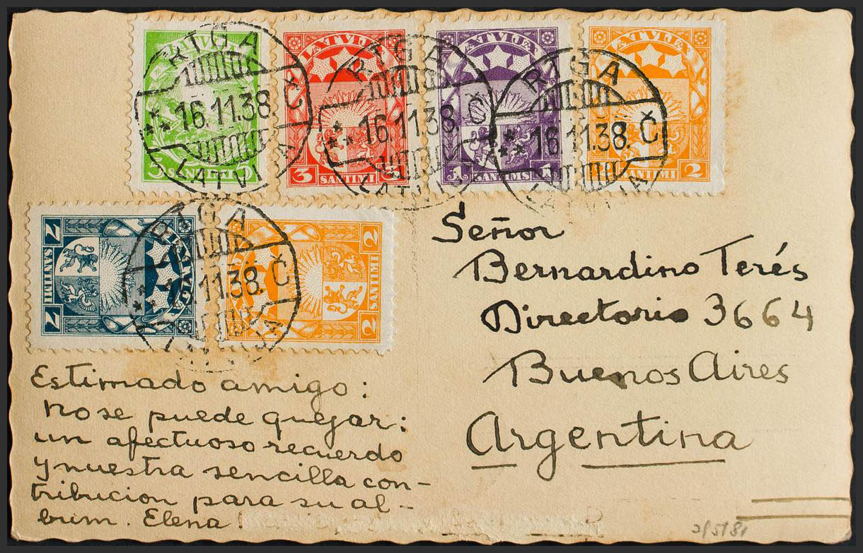 Yvert 172, 173, 174, 121, 122(2). 1938. Various values. Postcard from RIGA to BUENOS AIRES. On the back arrival. MAGNIFICENT AND UNUSUAL DESTINATION.