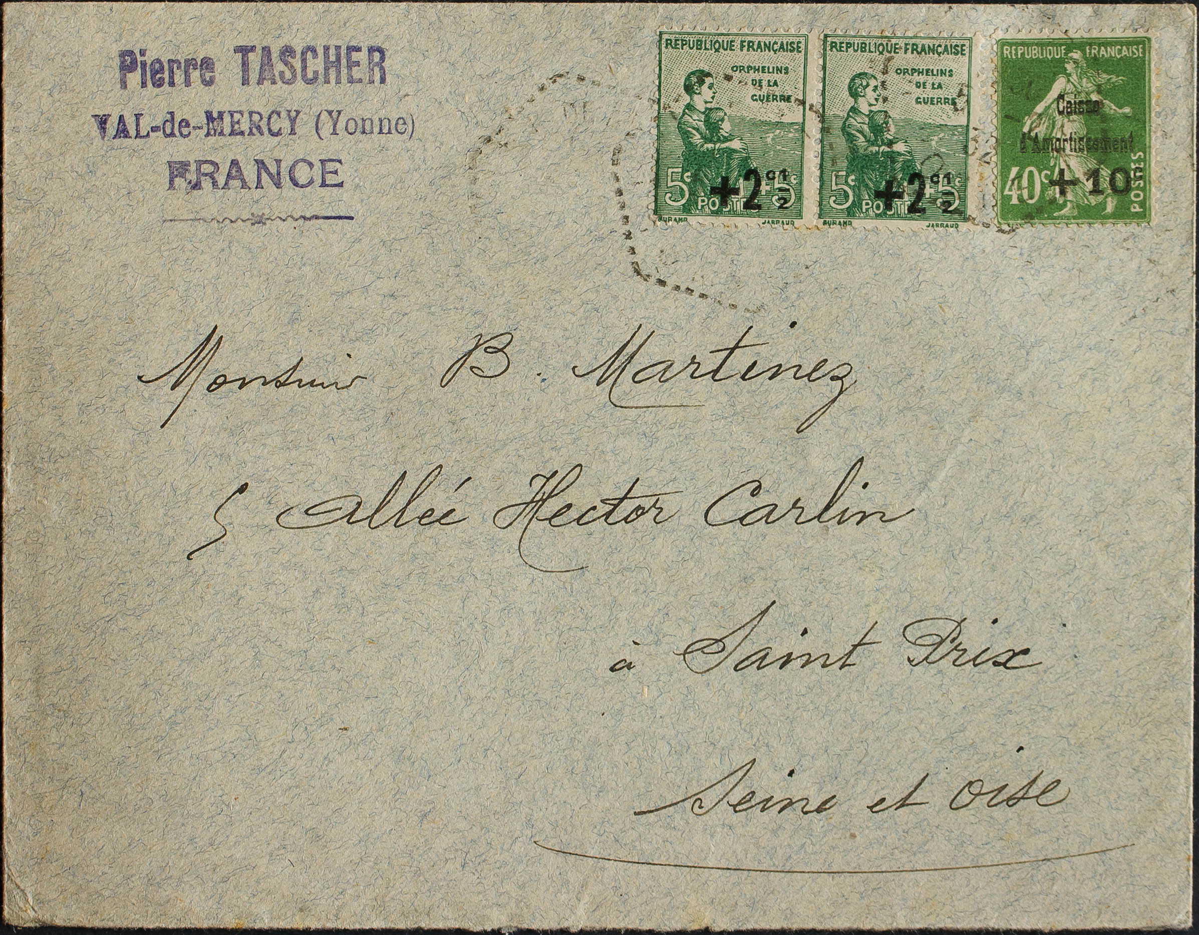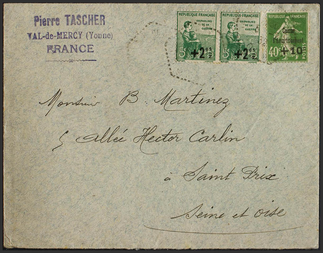 Yvert 253, 163(2). 1929. +10 cts over 40 cts green and +2 ½ cts over 5 cts green, two stamps. VAL DE MERCY to SAINT PRIX. On the back arrival. MAGNIFICENT.