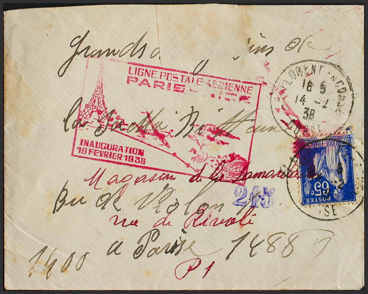 Yvert 365. 1938. 65 overseas cts. SAINT FLORENT (CORSICA) to PARIS. On the front it marks LIGNE POSTALE AERIENE / PARIS-NICE, in red and on the back arrival. MAGNIFICENT.