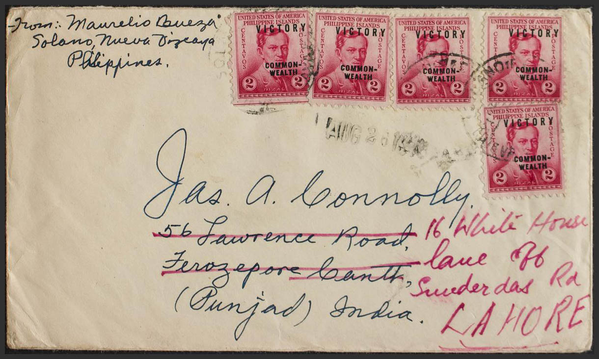 Yvert 319H(5). 1945. 2 pink cents, five stamps. SOLANO to FEROZEPUR (INDIA), forwarded to LAHORE. On the back transit. MAGNIFICENT.