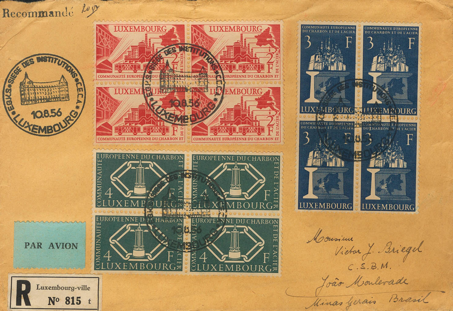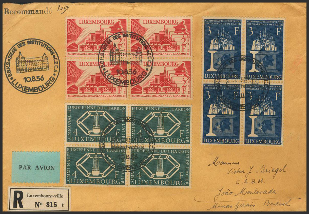Yvert 511/13(4). 1956. Complete series, block of four. Front of Certificate from LUXEMBOURG to MINAS GERAIS (BRAZIL). MAGNIFICENT. Yvert 2014: +130 Euros