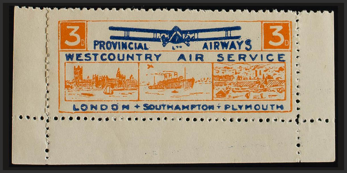 ★1935. 3 p orange and blue. PROVINCIAL AIRWAYS / WEST COUNTRY AIR SERVICE. MAGNIFICENT.