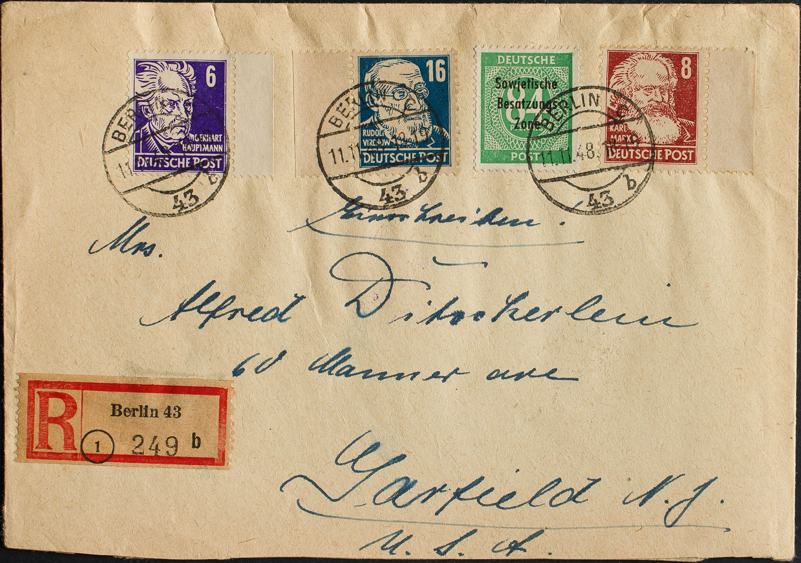 Yvert 33, 34, 38, 7. 1948. 6 p violet, 8 p red chestnut, 16 p blue and 84 p green. Certificate from BERLIN to GARFIELD (USA). On the back arrival. MAGNIFICENT.