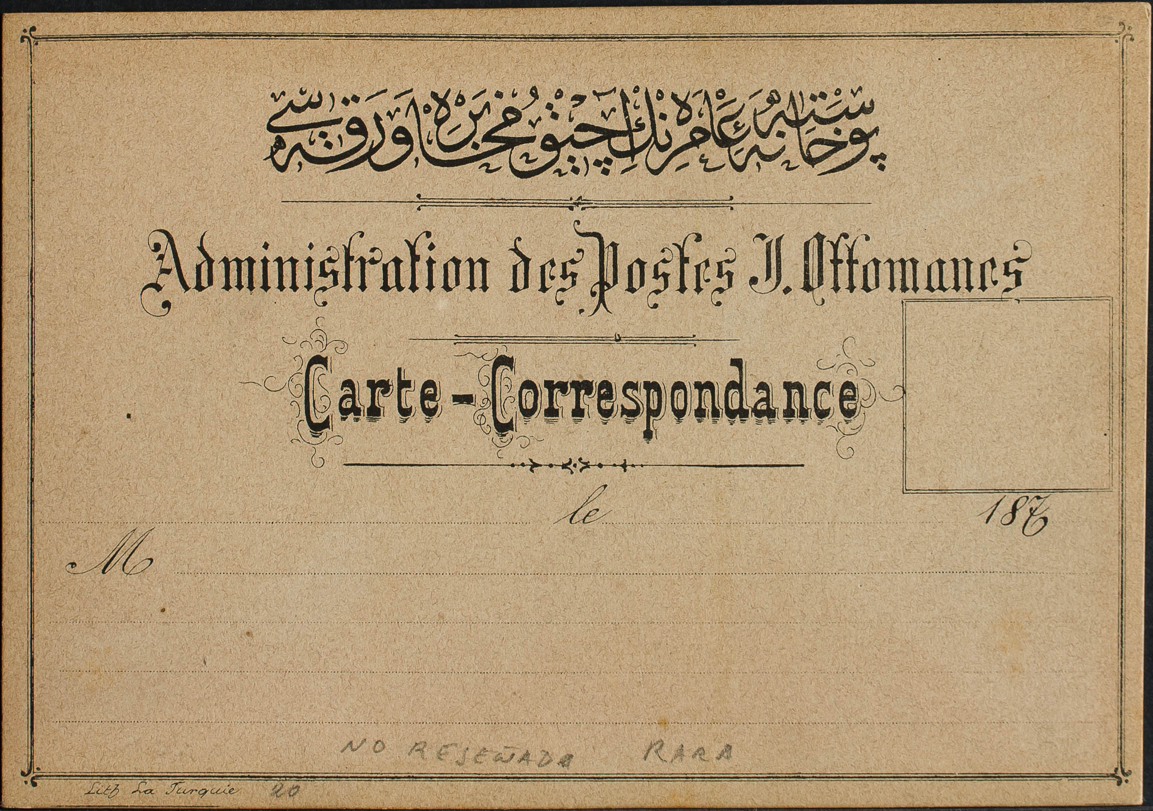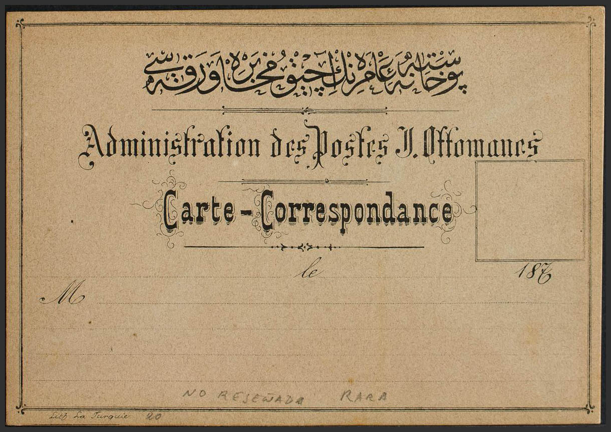 English (★)(1875ca). Precursor postage-free postcard on thick cardboard and legend ADMINISTRATION DES POSTES OTTOMANES / CARTE-CORRESPONDANCE. MAGNIFICENT AND RARE.