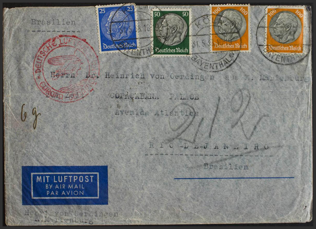 Yvert 453, 458, 461(2). 1938. 25p overseas, 50p green and 100p yellow and black, two stamps. Air Mail from COLONIA to RIO DE JANEIRO (BRAZIL). On the front mark DEUTSCHE LUFTPOST / EUROPA-SODAMERIKA, in red. MAGNIFICENT.