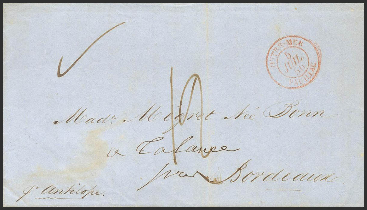 1850. SANTIAGO DE CUBA to TALENCE (FRANCE). Dater OUTRE-MER / PAUILLAC, handwritten steam name "By Antelope" and portage "12". MAGNIFICENT.