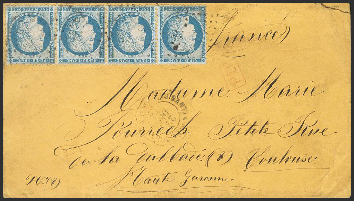 Yvert 60A(4). 1872. 25 cts blue FRANCE, strip of four. SANTIAGO DE CUBA to TOULOUSE (FRANCE). On the front octagonal date stamp SANTIAGO DE CUBA / PAQ.FR.D.1 and on the back date stamp LIGNE B / PAQ.FR.Nº2. MAGNIFICENT AND RARE.