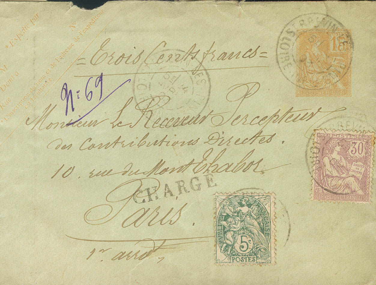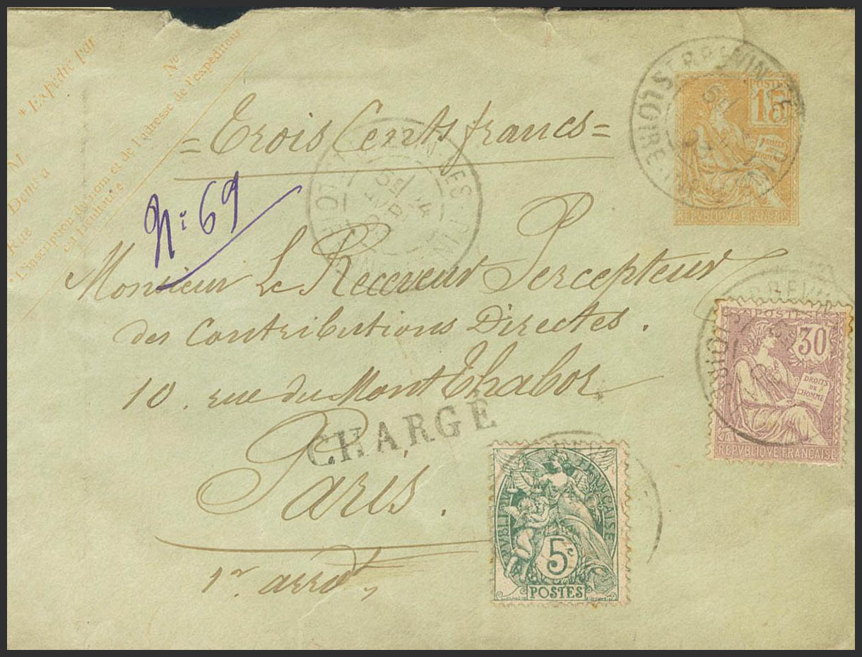 Yvert 128, 111. 1903. 15 cts orange on Certified Postal Envelope from SAINT BREVIN LES PINS to PARIS, with additional postage of 5 cts green and 30 cts lilac. Postmark ST.BREVIN LES PINS / LOIRE INFRE. MAGNIFICENT.