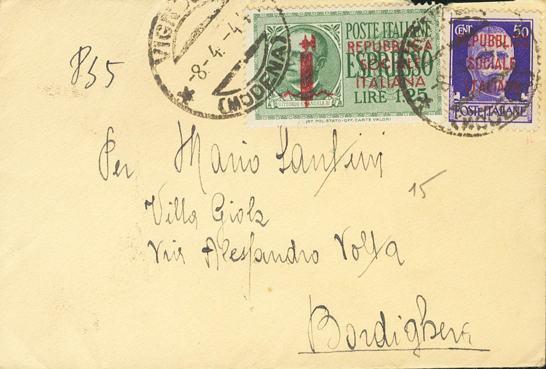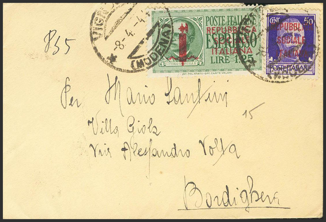 Yvert 23, Urgent 3. 1944. 50 purple cts and 1'25 green Urgent mail cts. VIGNOLA to BORDIGHERA. On the back arrival. MAGNIFICENT.