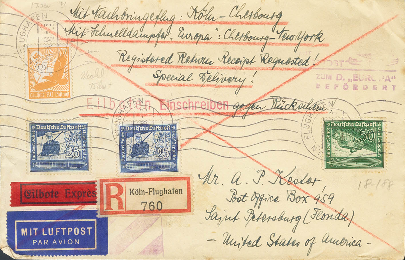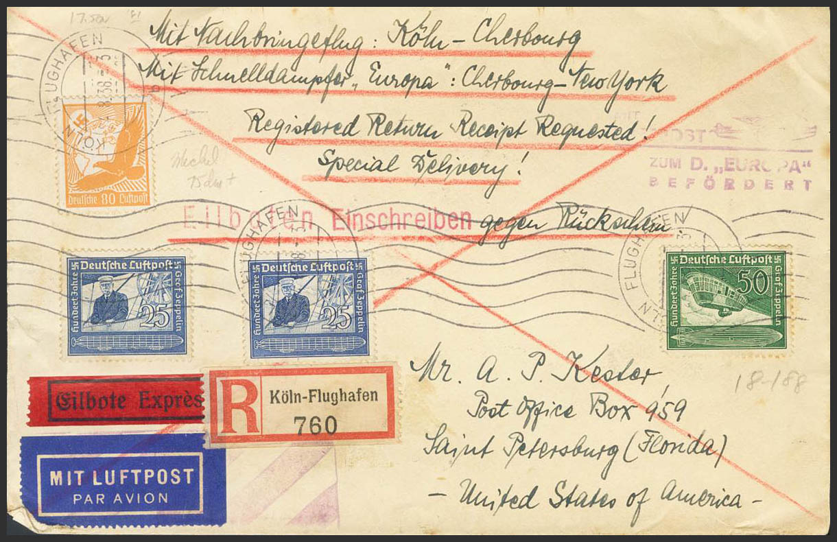 Yvert 57/58, 50. 1938. Complete series, 25p blue and 80p orange. Airmail CATAPULTED FROM THE GERMAN SHIP EUROPE from COLOGNE to SAINT PETERSBURG (USA). On the front it marks MIT LUFPOST / ZUM D. "EUROPA" / BEFÖRDERT and on the back arrival. MAGNIFICENT.