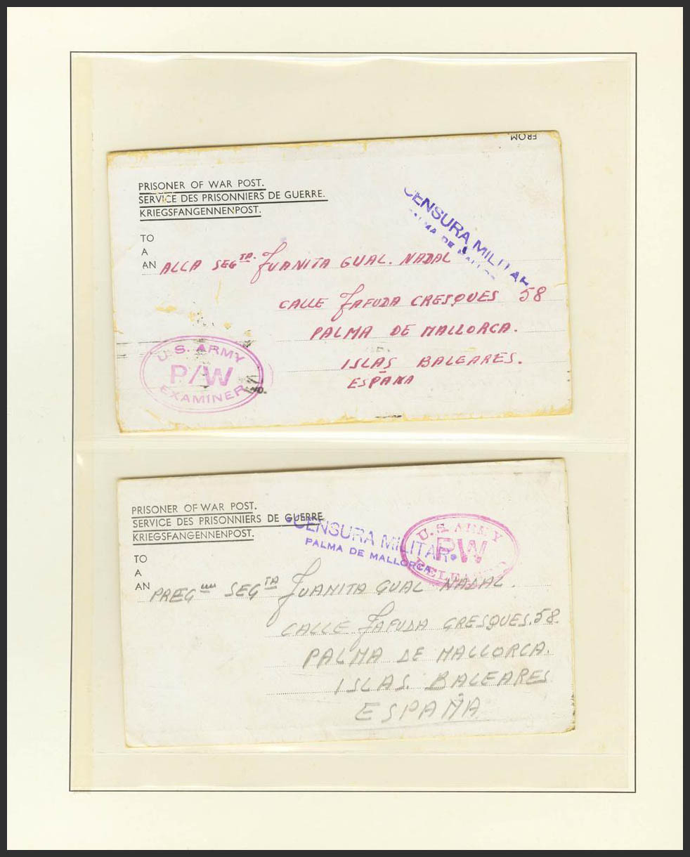 (1944ca). Interesting set of six envelopes-cards and three postcards with PRISONER OF WAR POST letterhead, sent by an Italian prisoner of the Aeronautical Weapon interned in Camps of Algiers and Naples with Spanish and North American censor marks. MAGNIFICENT AND UNUSUAL SET.