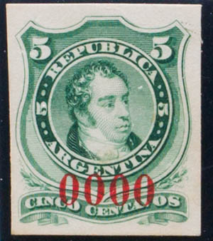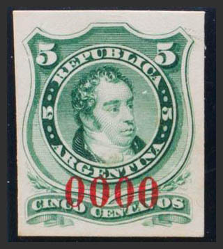 (★)Yvert 18. 1867. 5 cents green. COLOR ESSAY, on thick cardboard and numbered 0000, in red. MAGNIFICENT AND VERY RARE.