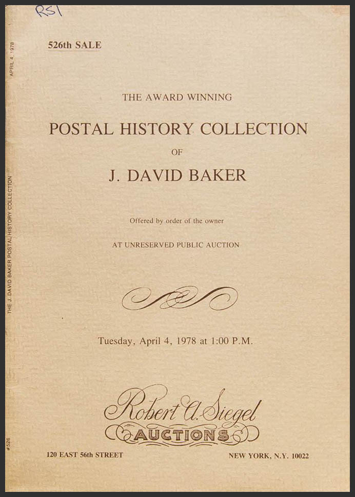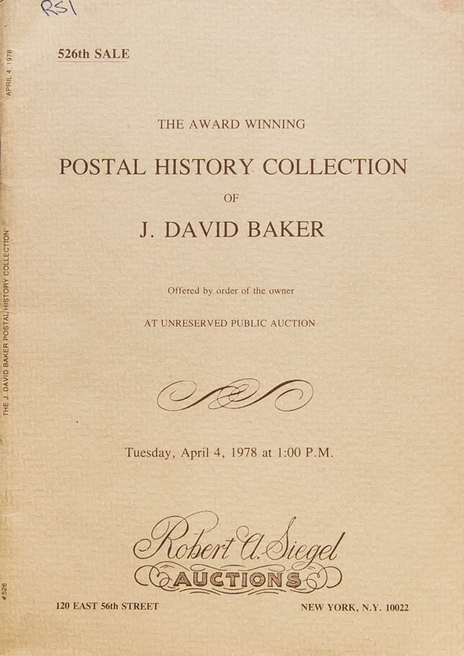 1978. Auction of THE AWARD WINNING POSTAL HISTORY COLLECTION OF J. DAVID BAKER, held on April 4, 1978. Robert A.Siegel Auctions. New York, 1978.