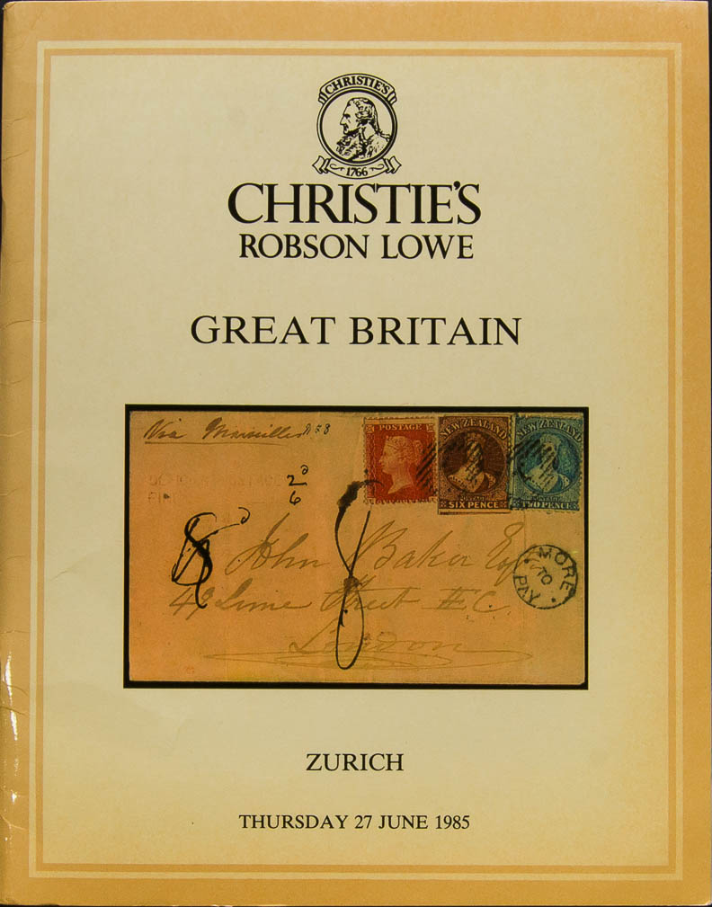 1985. Catalog of the GREAT BRITAIN collection, held on June 27, 1985. Christie's and Robson Lowe. Zürich, 1985.