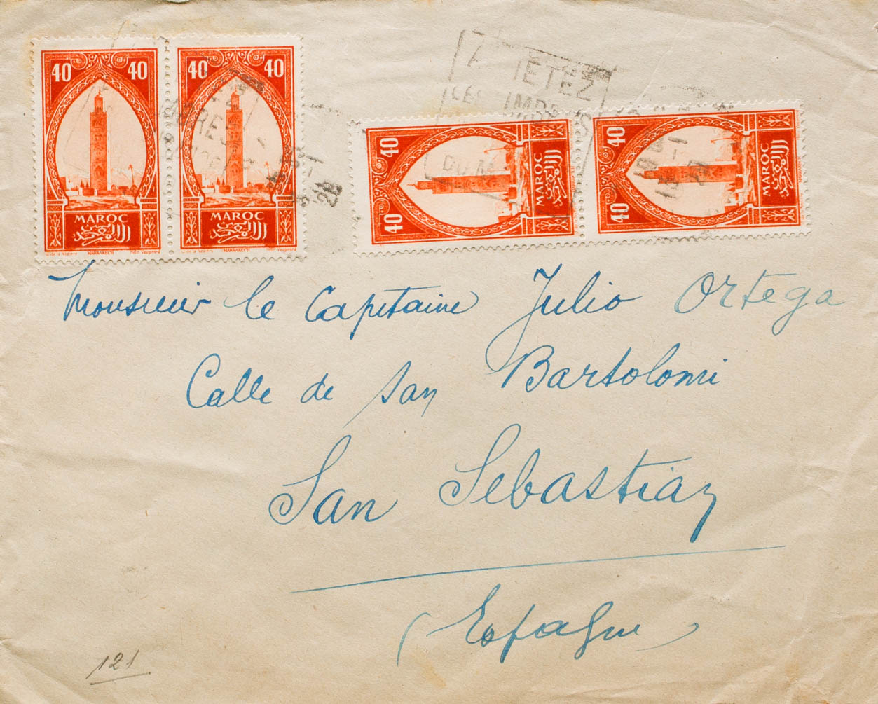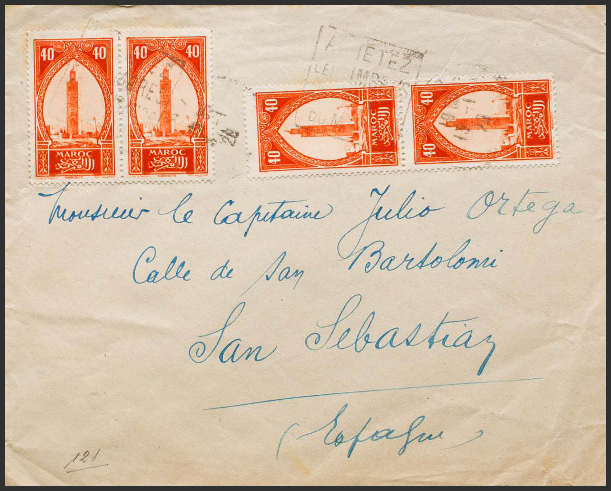 English Yvert 110(4). 1928. 40 orange cts, four stamps. FES to SAN SEBASTIAN. On the back arrival. MAGNIFICENT.