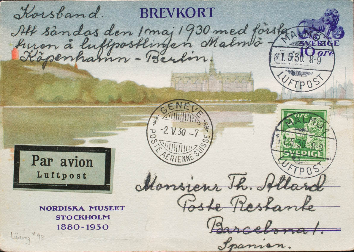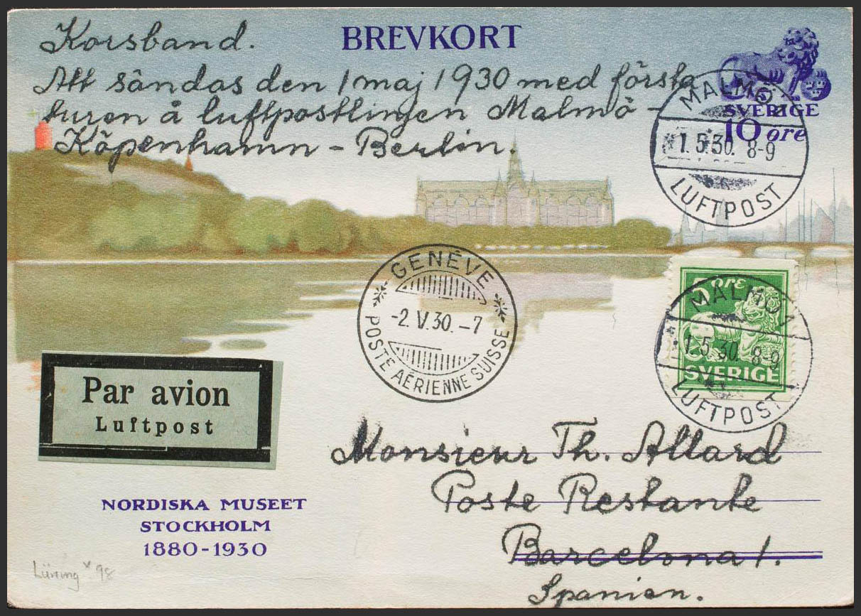Yvert 123b. 1930. 10 ore violet on Entire Illustrated Postal Card from MALMÖ to BARCELONA, with complementary postage of 5 ore green. Transported on the First Flight Copenhagen-Berlin and circulated via Geneva and on the back it marks I ARRIVED BY LAND and arrival. MAGNIFICENT.
