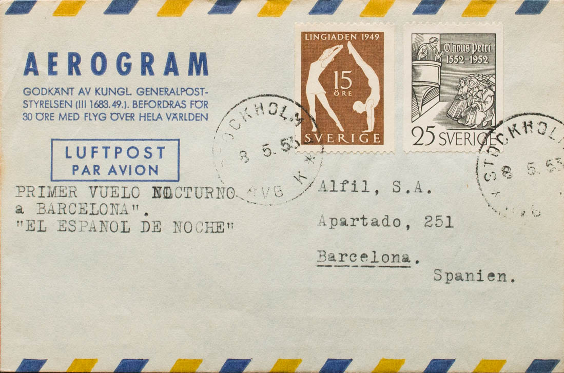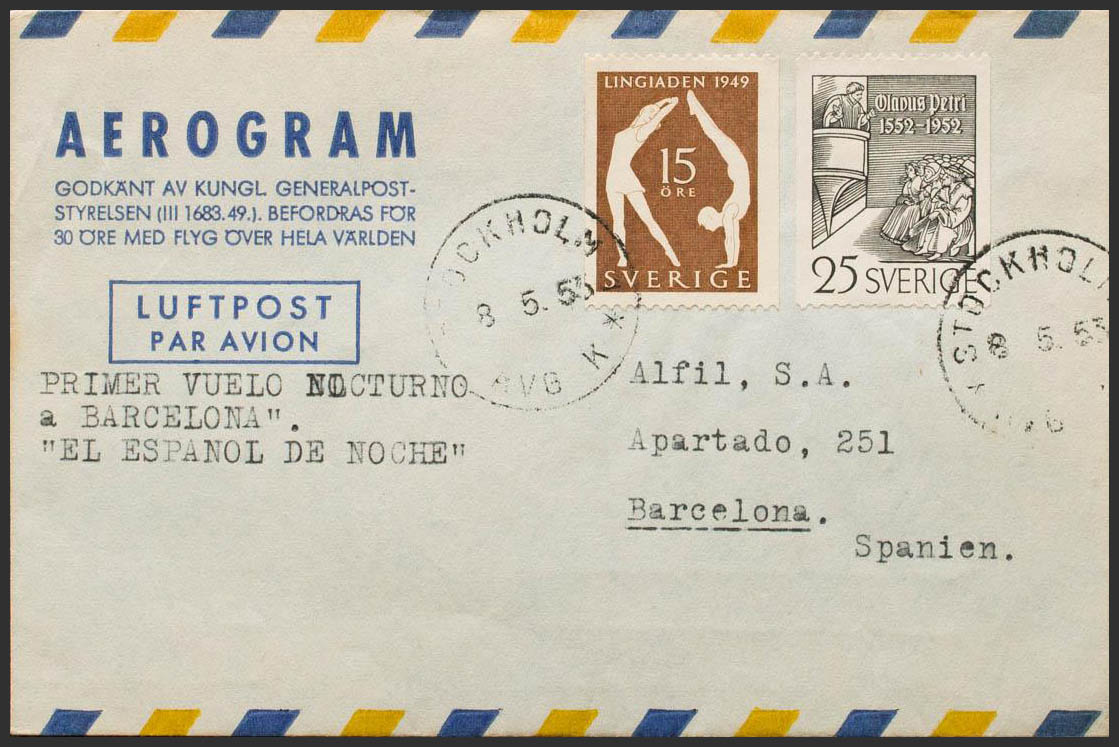 Yvert 367, 351. 1953. 25 ore black and 15 ore brown. Airgram from STOCKHOLM to BARCELONA. On the front text FIRST NIGHT FLIGHT TO BARCELONA "THE SPANISH BY NIGHT", on the back arrival. MAGNIFICENT.