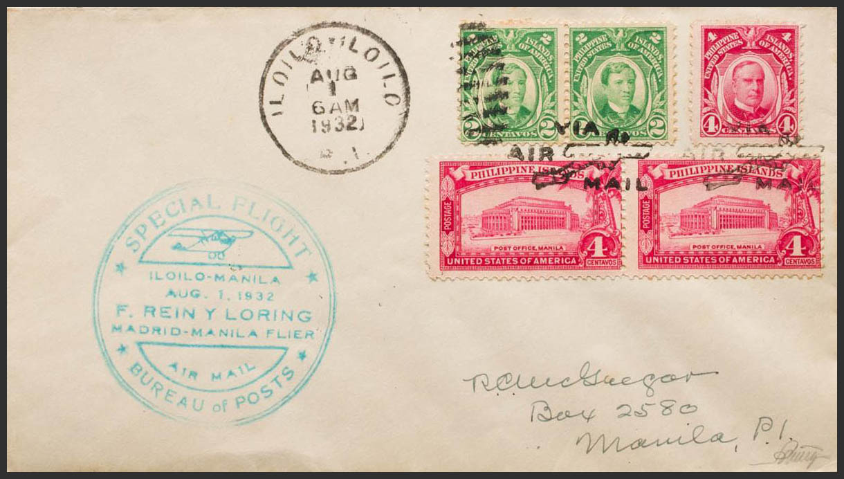 Yvert 204(2), 205, 235(2). 1932. 2 cents green, two stamps, 4 cents red and 4 cents rose red, two stamps. ILO-ILO to MANILA. Postmark VIA / AIR / MAIL and on the front mark SPECIAL FLIGHT / ILO-ILO-MANILA / F.REIN Y LORING / MADRID-MANILA FLIER / AIR MAIL / BUREAU OF POSTS, in blue-green and arrival on the back. MAGNIFICENT.
