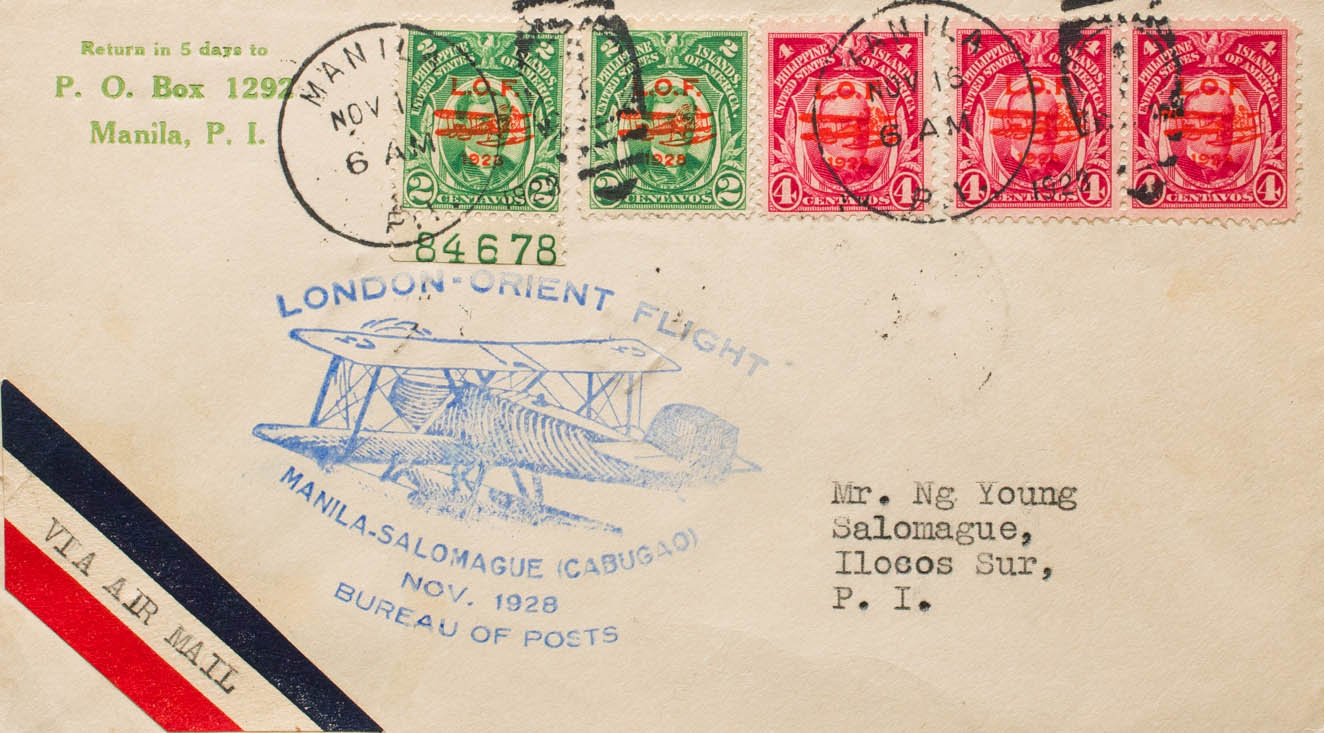 Yvert 15(2), 16(3). 1928. Green 2 cents, two stamps and red 4 cents, three stamps. Airmail from MANILA to SALOMAGUE. On the front is the brand LONDON-ORIENT FLIGHT / MANILA-SALOMAGUE (CABUGAO) / BUREAU OF POSTS, in blue and arrival on the back. MAGNIFICENT.