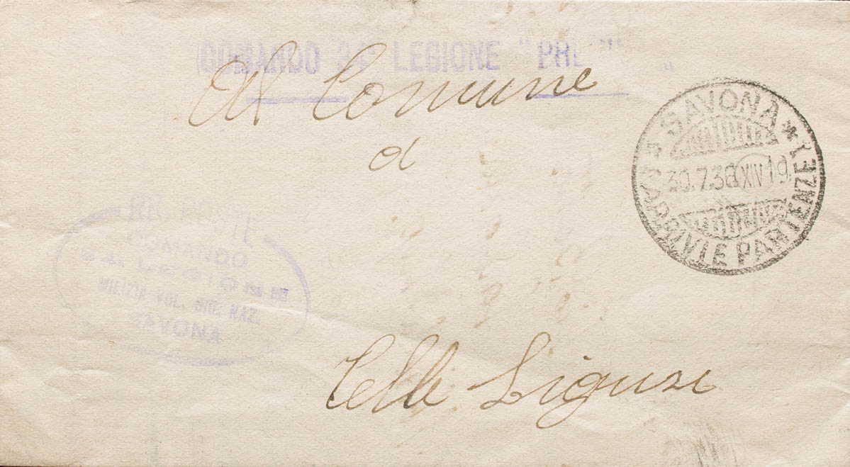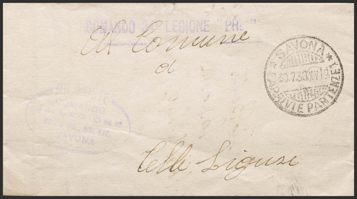 English 1936. SAVONA to CELLE LIGURE. RR marks POST / COMMAND / "34" LEGION / MILIZIA VOL.SIC.NAZ. / SAVONA and lineal COMANDO 34ª LEGIONE "PREMUDA", both in violet. MAGNIFICENT.