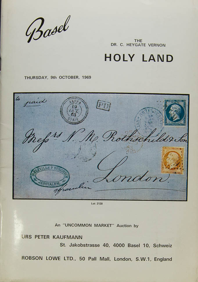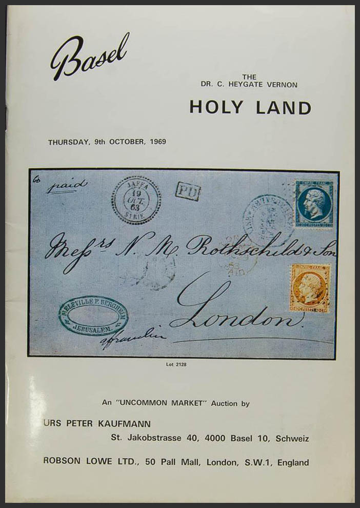 English 1969. Auction catalog of the HOLY LAND collection, held on October 9, 1969. Robson Lowe. Basel, 1969.
