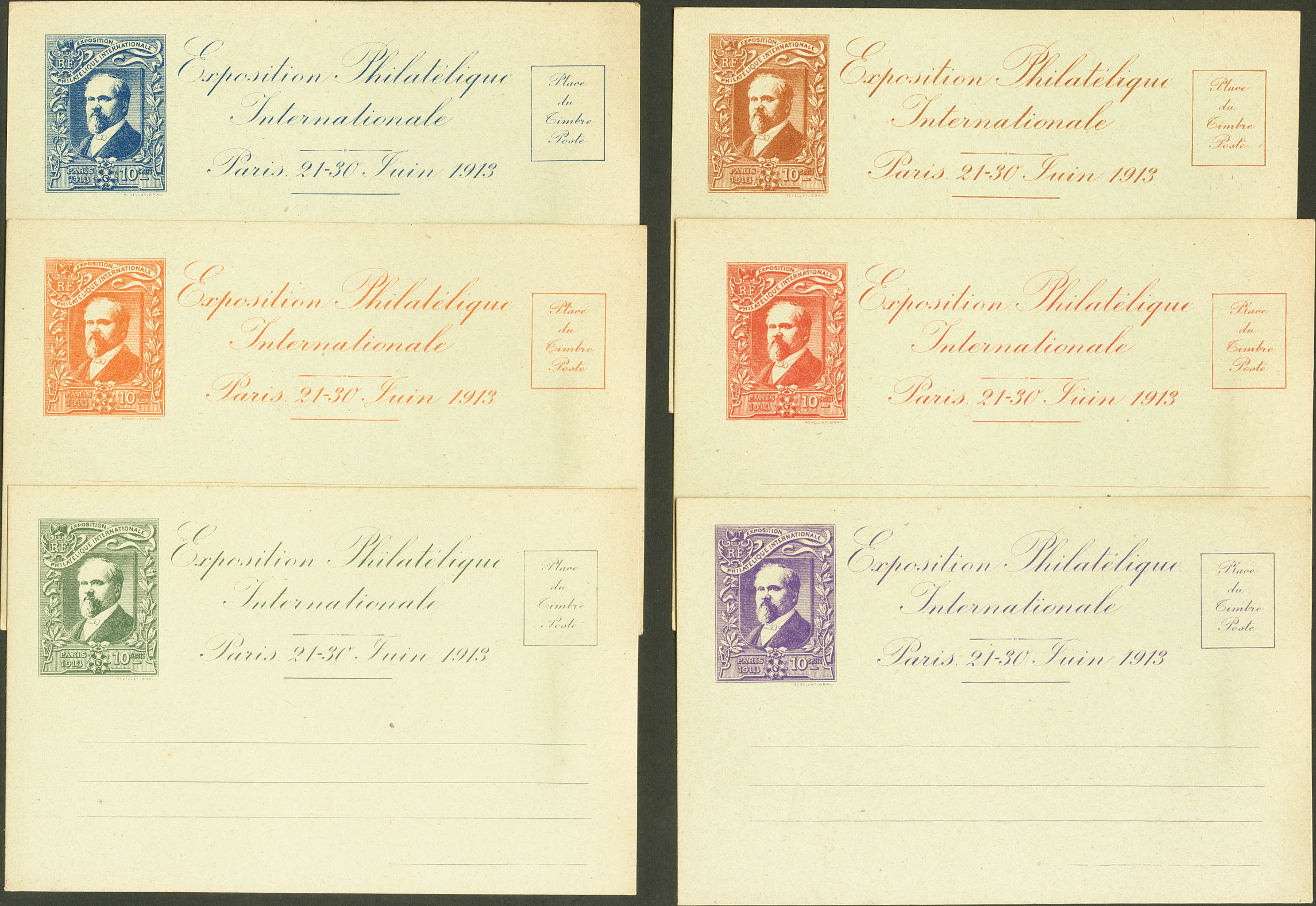 (★)1913. Complete set of six Pseudo-Whole Cards Postcards from the EXPOSITION PHILATELIQUE INTERNATIONALE DE PARIS 1913. MAGNIFICENT AND RARE SET.