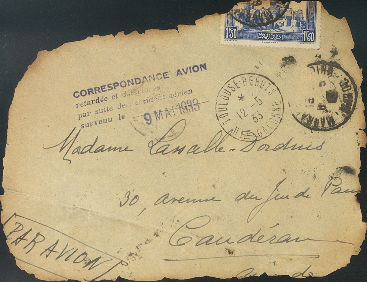 English 1933. 1'50 f blue from French Morocco. Air Mail from CASABLANCA to CAUDERAN (FRANCE). Latecoere 28 plane of the CASABLANCA-TOULOUSE line crashed in Viladrau (Gerona) on May 9, 1933, killing the crew and three passengers, the correspondence was recovered partially burned and sent to its destination with the mark CORRESPONDANCE-AVION / RETARDEE ET DETERIOREE / PAR SUITE DE L´ACCIDENT AERIEN / SURVENU LE 9 MAI 1933. MAGNIFICENT AND VERY RARE.