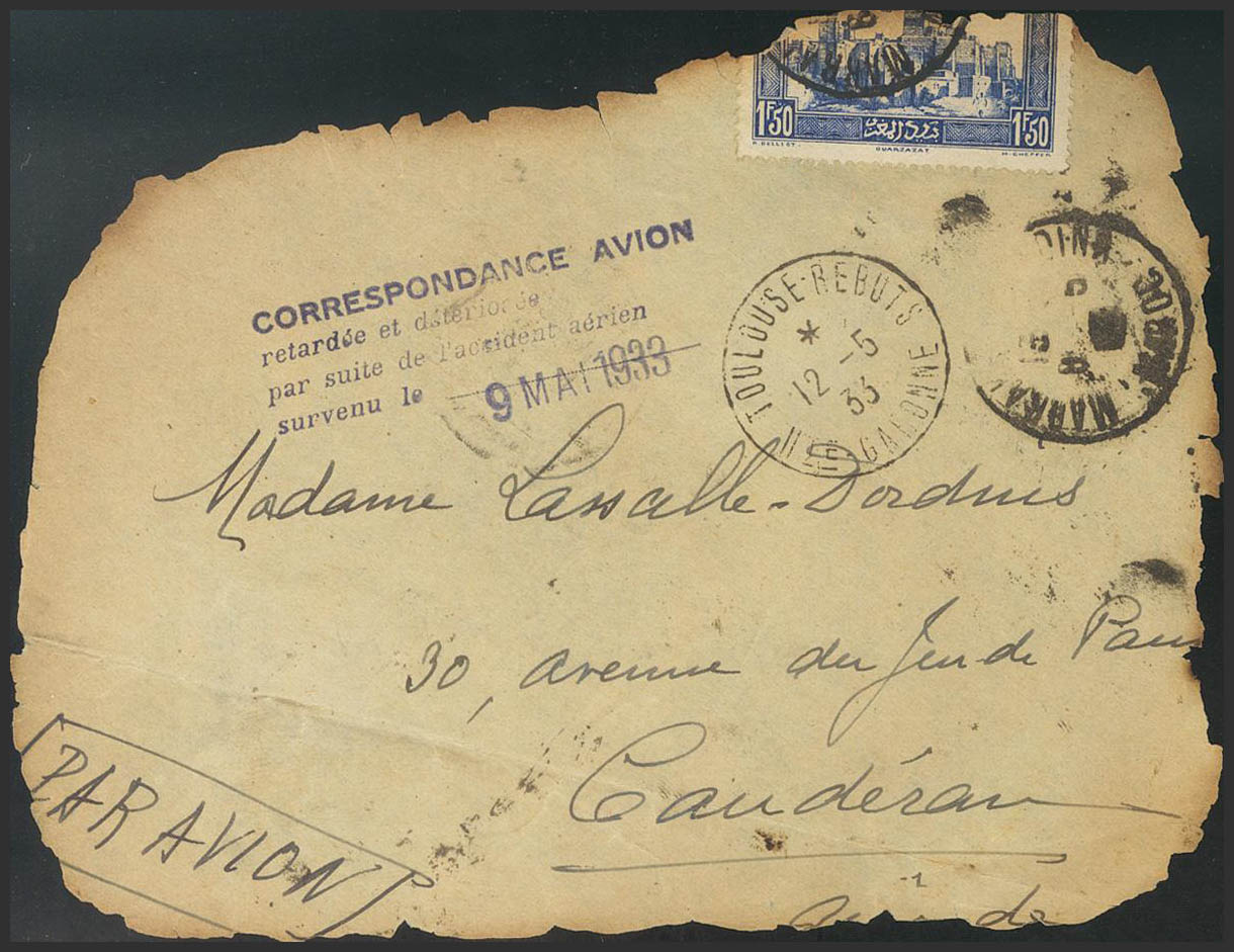 1933. 1'50 f blue from French Morocco. Air Mail from CASABLANCA to CAUDERAN (FRANCE). Latecoere 28 plane of the CASABLANCA-TOULOUSE line crashed in Viladrau (Gerona) on May 9, 1933, killing the crew and three passengers, the correspondence was recovered partially burned and sent to its destination with the mark CORRESPONDANCE-AVION / RETARDEE ET DETERIOREE / PAR SUITE DE L´ACCIDENT AERIEN / SURVENU LE 9 MAI 1933. MAGNIFICENT AND VERY RARE.