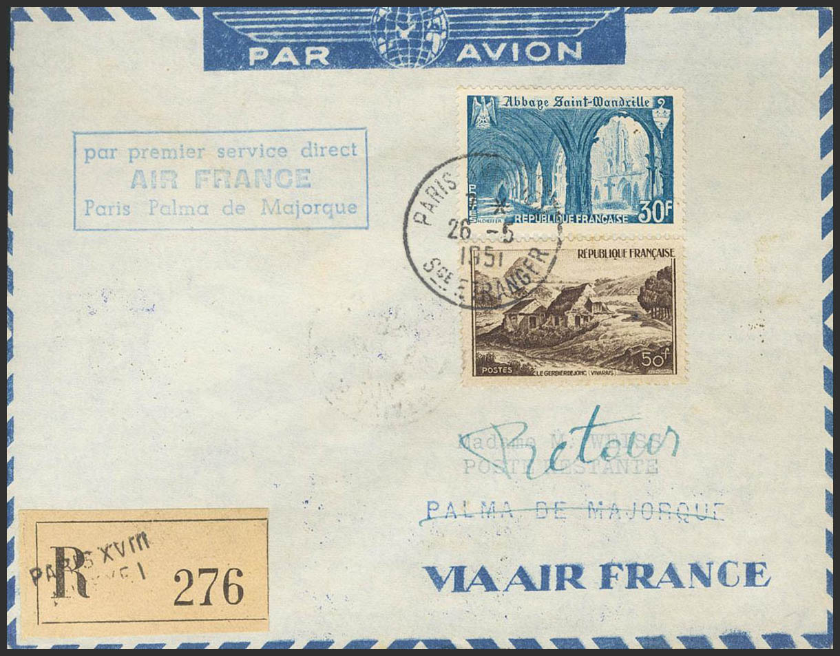 English 842, 843, 679(2). 1951. 30 f ultramarine, 50 f chestnut and 1.50 f lilac, two stamps (on the back). PARIS to PALMA DE MALLORCA. On the front it marks PAR PREMIER SERVICE DIRECT / AIR FRANCE / PARIS-PALMA DE MAJORQUE, in blue and returned to the sender, applying the mark on the back IT WAS ON LIST. MAGNIFICENT AND VERY RARE.