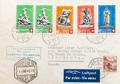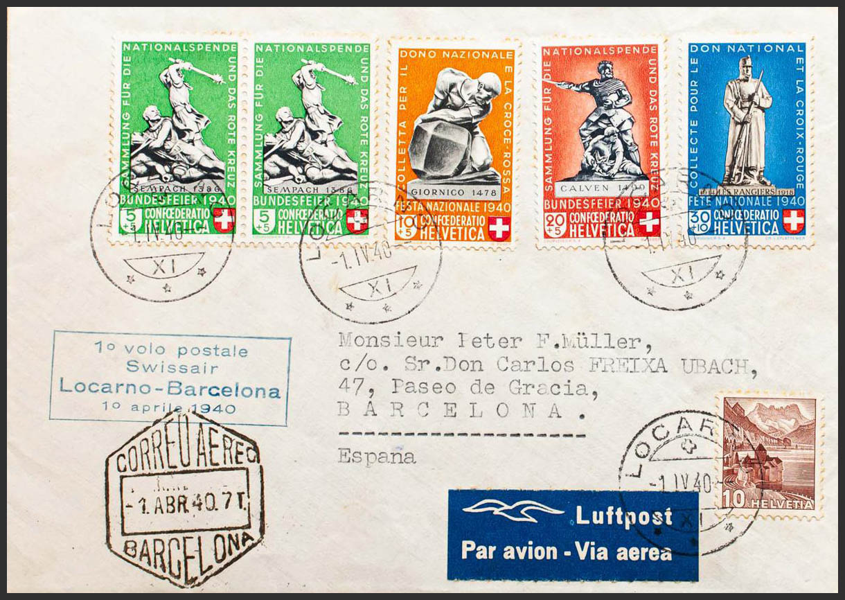 English 349(2), 350, 351, 353. 1940. 5 cts+5 cts green, two stamps, 10 cts+5 cts, 20 cts+5 cts, 30 cts+10 cts and 10 cts. Air Mail from LOCARNO to BARCELONA. On the front it marks 1º VOLO POSTALE / SWISSAIR / LOCARNO-BARCELONA, in blue and arrival. MAGNIFICENT.