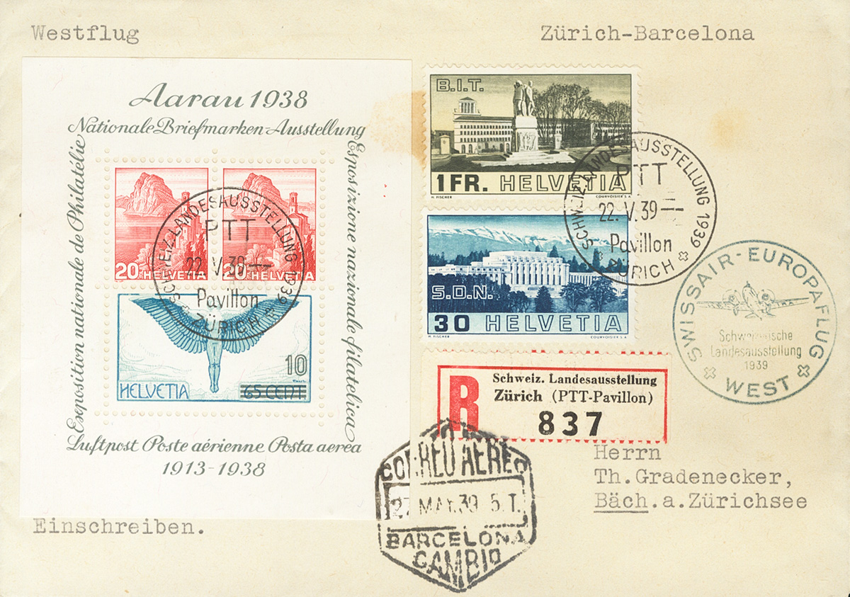 308, 310, HB4. 1939. 30 cts blue, 1 f black and block sheet. Certificate from ZURICH to BÄCH. On the front it marks SWISSAIR-EUROPAFLUG / WEST and transit AIR MAIL / BARCELONA. MAGNIFICENT.